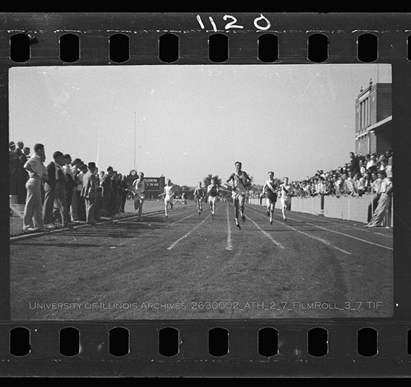 Illinois High School students participate in track and field events at the Interscholastic Track Meet in May 1936. This two-day event, held May 15th and 16th, brought over 600 students from across the state to compete in Memorial Stadium in this pre-cursor to the IHSA State Meet. This image features students running what appears to be the 400 meter sprint. Due to the volatile nature of Nitrate Film, digital file can be found at: https://medusa.library.illinois.edu/cfs_files/54134610