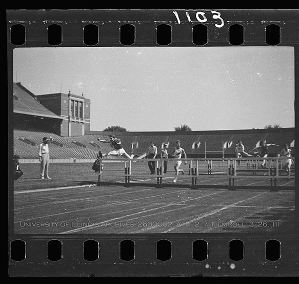 Illinois High School students participate in track and field events at the Interscholastic Track Meet in May 1936. This two-day event, held May 15th and 16th, brought over 600 students from across the state to compete in Memorial Stadium in this pre-cursor to the IHSA State Meet. This image features students running a 200 meter hurdles. Due to the volatile nature of Nitrate Film, digital file can be found at: https://medusa.library.illinois.edu/cfs_files/54134554