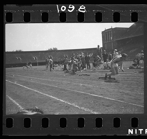 Illinois High School students participate in track and field events at the Interscholastic Track Meet in May 1936. This two-day event, held May 15th and 16th, brought over 600 students from across the state to compete in Memorial Stadium in this pre-cursor to the IHSA State Meet. This image features students in the blocks lined up for the 400 meter sprint. Due to the volatile nature of Nitrate Film, digital file can be found at: https://medusa.library.illinois.edu/cfs_files/54134564