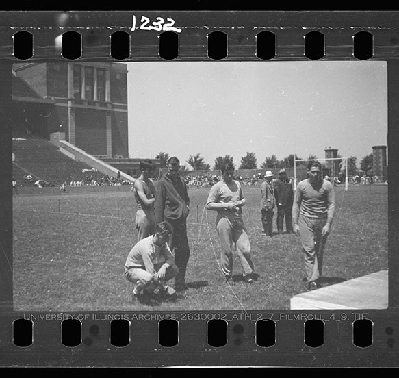 Illinois High School students participate in track and field events at the Interscholastic Track Meet in May 1936. This two-day event, held May 15th and 16th, brought over 600 students from across the state to compete in Memorial Stadium in this pre-cursor to the IHSA State Meet. Competitors stand on and around the victor's platform following their race. Due to the volatile nature of Nitrate Film, digital file can be found at: https://medusa.library.illinois.edu/cfs_files/54134686
