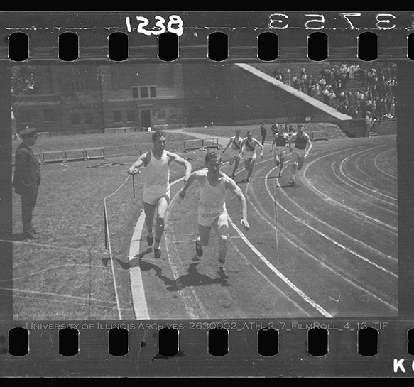 Illinois High School students participate in track and field events at the Interscholastic Track Meet in May 1936. This two-day event, held May 15th and 16th, brought over 600 students from across the state to compete in Memorial Stadium in this pre-cursor to the IHSA State Meet. This image features students running the 4x200 meter relay. Due to the volatile nature of Nitrate Film, digital file can be found at: https://medusa.library.illinois.edu/cfs_files/54134624