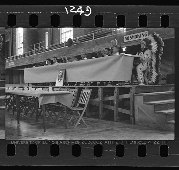 The Pow-Wow Luncheon was held inside the skating rink and hosted by the Athletic Association, Alumni Association, and the "Tribe of Illini". Due to the volatile nature of Nitrate Film, digital file can be found at: https://medusa.library.illinois.edu/cfs_files/54134644
