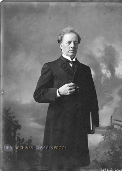 Portrait of Edmund Janes James, University President from 1904-1920, in trademark pose, with glasses and book in hand.