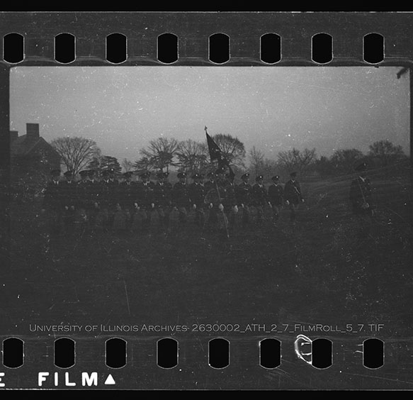 A fall military review day of the university Military is featured with all branches of the military and the military band present. The fall review does not feature the same pomp and circumstance of the spring review day. Consequently, R.O.T.C members are featured but not awarded honors. Instead, at the fall review, the Pershing Rifle Awards and the artillery showcase is demonstrated to the public. Due to the volatile nature of Nitrate Film, digital file can be found at: https://medusa.library.illinois.edu/cfs_files/54134752