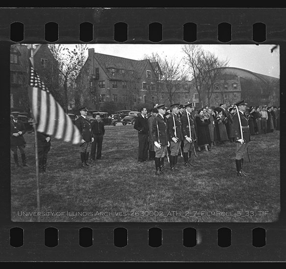 A fall military review day of the University Military is featured with all branches of the military and the military band present. The fall review does not feature the same pomp and circumstance of the spring review day. Consequently, R.O.T.C members are featured but not awarded honors. Instead, at the fall review, the Pershing Rifle Awards and the artillery showcase is demonstrated to the public. Due to the volatile nature of Nitrate Film, digital file can be found at: https://medusa.library.illinois.edu/cfs_files/54134740