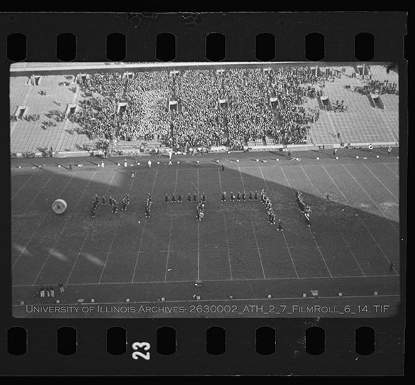 A November 23rd, 1935, band halftime show from the game between the University of Illinois and the University of Chicago is featured. The band is marching in the formation of the "Illini" phrase. Due to the volatile nature of Nitrate Film, digital file can be found at: https://medusa.library.illinois.edu/cfs_files/54134768