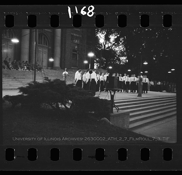 The different men's choir groups assemble on the steps of Foellinger Hall for their annual honors concert. The choirs are to honor the mortarboard inductees and new members of the Atius and Sachem honors societies. Due to the volatile nature of Nitrate Film, digital file can be found at: https://medusa.library.illinois.edu/cfs_files/54134868