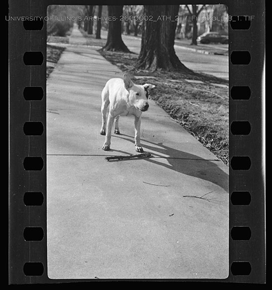 A white bulldog is standing on a sidewalk in residential Urbana. Based on the curtilage around the dog, the trees that remain to this day, and the paved streets rather than brick, this image appears to be at 1010 South Busey Street, Urbana Illinois. Strauchâ??s home is just out of frame, at 601 W Ohio Street, corroborating this location for the dog/ Due to the volatile nature of Nitrate Film, digital file can be found at: https://medusa.library.illinois.edu/cfs_files/54134882