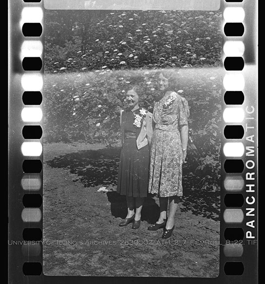 Two women stand together for a picture in a rose garden. All image degradation was present prior to digitization.