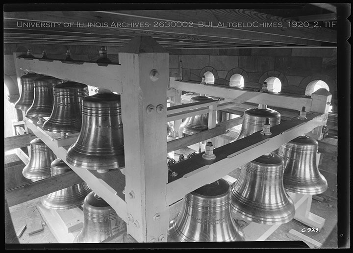 Featured are the Altgeld Senior Memorial Chimes following their installation in the chime-tower. The chimes were a gift by the class of 1914 and were installed and dedicated in 1920.