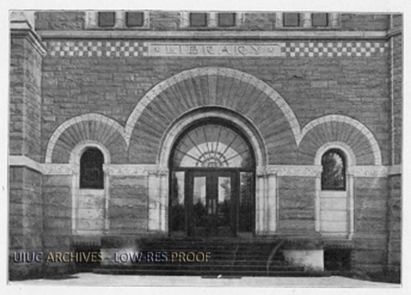 Altgeld Hall main entrance with 'LIBRARY' engraved over the entry, from when it was the Library Building. Image from Library Building Pamphlet.