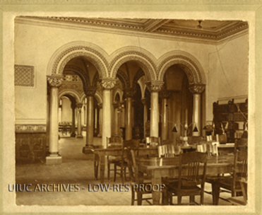 Looking out through a study room into the Reception Hall of Altgeld Hall when it was the Library Building.