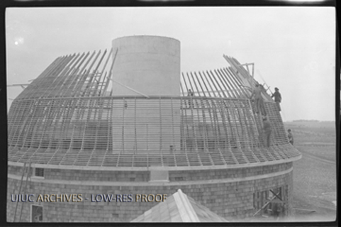Close-up view of one of the round barns on the University of Illinois campus with its roof under construction