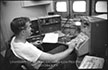 Photograph of a WILL-TV crewmember wearing a headset in control room operating equipment and monitoring screens.