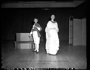 Two women on stage during an opera workshop. White writing is vible on the bottom edge of the photograph. Set pieces are visible in the background.