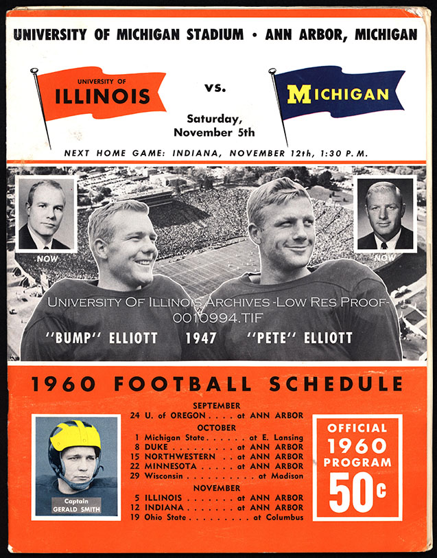 Cover of the program for the 1960 football game between Michigan and Illinois played in Ann Arbor at the University of Michigan Stadium. The cover features pictures of brothers turned coaches "Bump" and "Pete" Elliot who both played for Michigan, with "Bump" now the head coach of Michigan and "Pete" the head coach of Illinois.