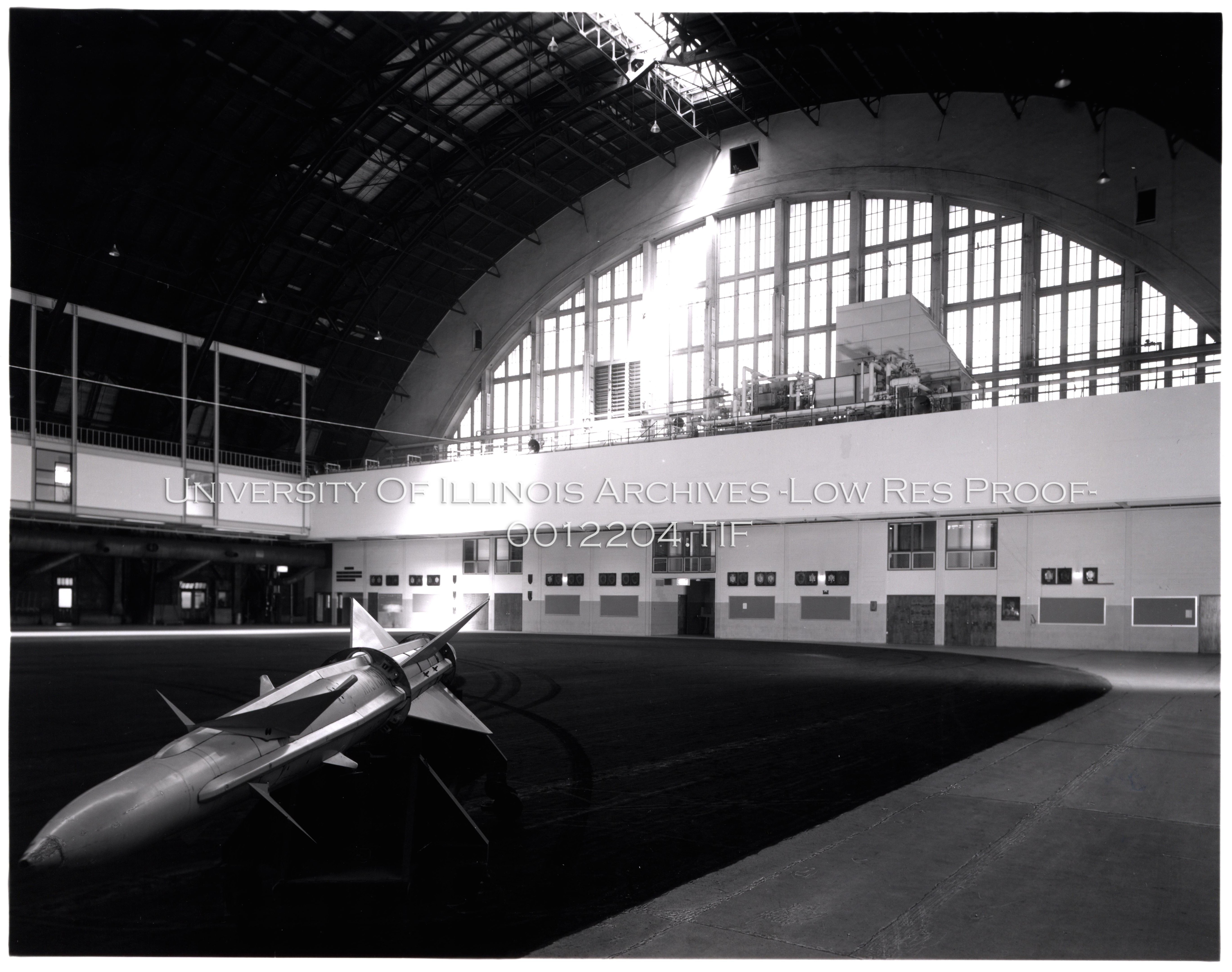 Photograph of a Missile on display in the University Armory, sometime around the building's modernization in the 1960s.