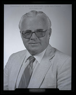 Black and white portrait of Harold Cook. He is wearing a light colored suit and metal rimmed glassess. His tie has diagonal stripes. His folder lists his department as campus parking.