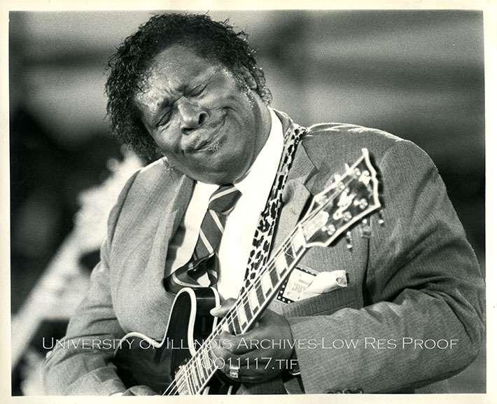 BB King playing his guitar. He is wearing a suit, tie, and a ring. His eyes are closed. On the back of the image the following is written in blue ink: "pq.1 79%" and "John Konstantaras."
