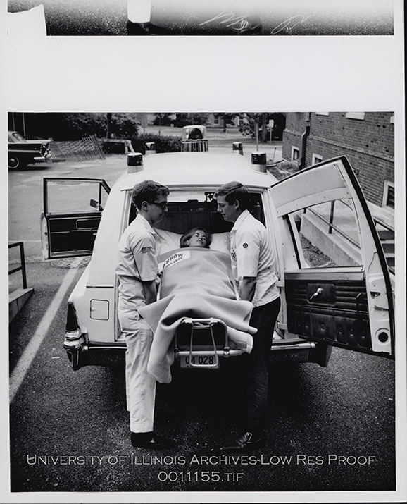Woman being placed inside an ambulance by two medical professionals. The ambulance is parked in a parking lot next to a building. Another car and a ramp is visible along the left side. The ambulance driver-side door is open. The two professionals have a short haircuts and the man on the ledt is weaing glasses. The woman has her eyes closed and is underneath a blanket reading "Arrow Ambulance."