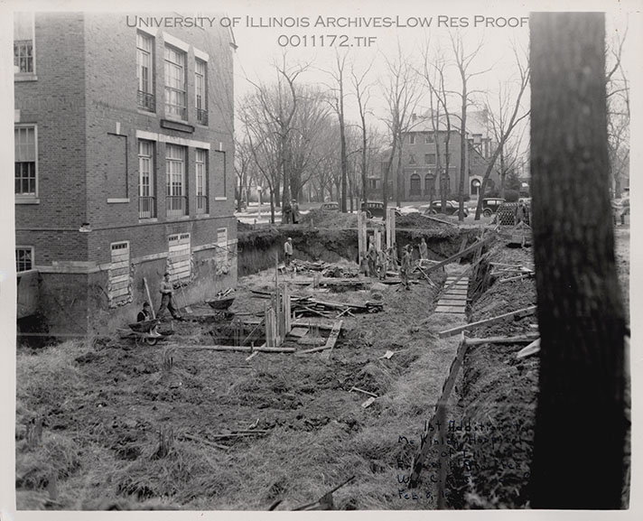 Black and white photograph of the construction of the McKinley Hospital Addition. A hole was dug out for the addition and the lower windows of the hospital are boarded up. Several people are working in the hole as two people talk outside of it. Wooden boards, wheelbarrows, and other constuction equipment lay strewn about. Several cars are parked on the road behind the constuction. The trees are barren. The following is written in the lower right corner of the image: "1st Addition to McKinley Hospital University of Illinois, Ernest L. Stoaffer Architect, Wm. C. F. Kuhne Contractor, Feb. 8, 1939 #1."
