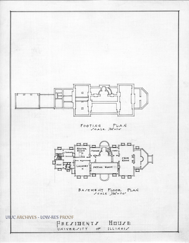 President's House - Progress plan page 2 with the footing plan and basement plan. Printed on wax linen.