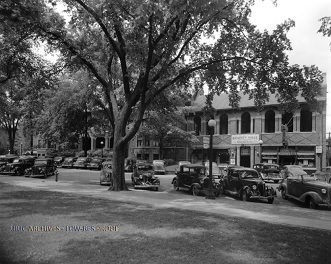 Several cars parked on Wright Street near Altgeld Hall at the University of Illinois with Bradley Hall clearly visible in the background.