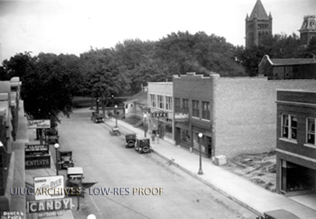 View of several store fronts and cars along Green Street, looking east towards Wright Street and Altgeld Hall. Businesses include: Duncan Studio, Mosi-Over, Twin City Cafe, and The Green TeaPot.