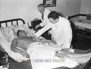 University professor of physical education, Thomas K. Cureton performs tests on famed Olympic athlete Jesse Owens.