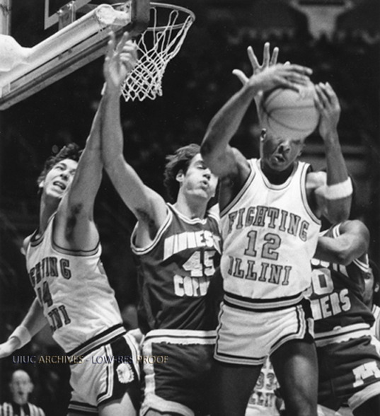 Derek Harper (12) and Derek Holcomb (44) of the Illini vie for a rebound along with Randy Breuer (44) and Darryl Mitchell (30) of Minnesota. Illinois won 80-76.