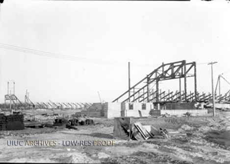 The beginning stages of construction of University of Illinois Memorial Stadium. Looking southeast from northwest corner. April Illinois Alumni News identifies shows this image with "Strauch" written on bottom left corner.