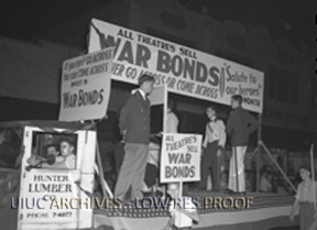 Men on a float with banners and signs supporting purchasing war bonds, specifically mentioning theaters as vendors.