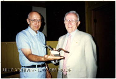 The Silver Plow Award of the American Society is presented to Fay Sims (right) by Harold Guither (left) in recognition of Mr. Sims' ten years of service as chapter Secretary-Treasurer. The presentation was made at the East Central Group of Illinois Societ