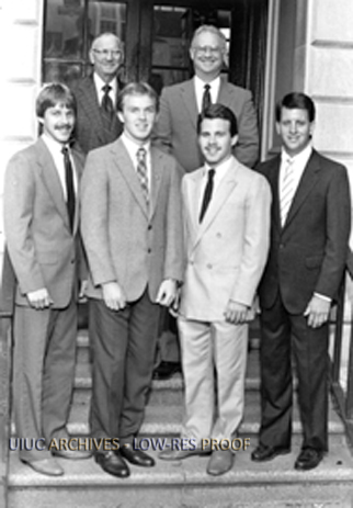 Group photo of the recipients of scholarships in the Agricultural Economics Department at the U of I. Back row from l to r are R. Gish and W. George, front row from l to r are D. Kapplin, d. Close, S. Newport, and J. Adcock.