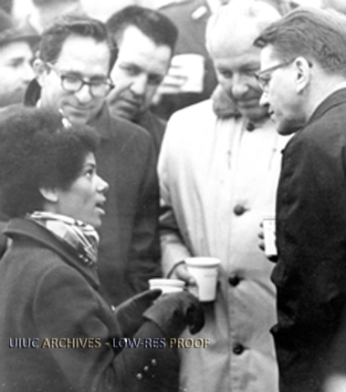 Illinois Lieutenant Governor Paul Simon (right) speaks with individuals including University of Illinois Homecoming Queen, Charlynn Chamberlain and Chancellor J. Peltason (left, behind Ms. Chamberlain).