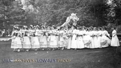 Young women participate in the procession of the Queen's Coach during May Fete festivities at the University of Illinois.