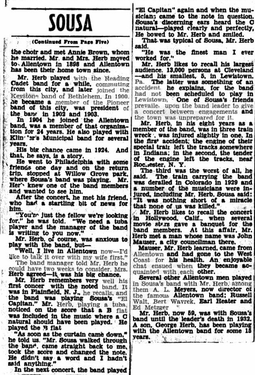 Digital File 80: Newsclipping highlighting William Herb's career as a member of the Sousa Band during the 1920s, ca. 1938
