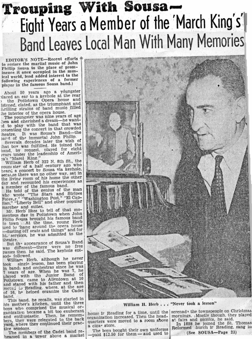 Newsclipping highlighting William Herb's career as a member of the Sousa Band during the 1920s
