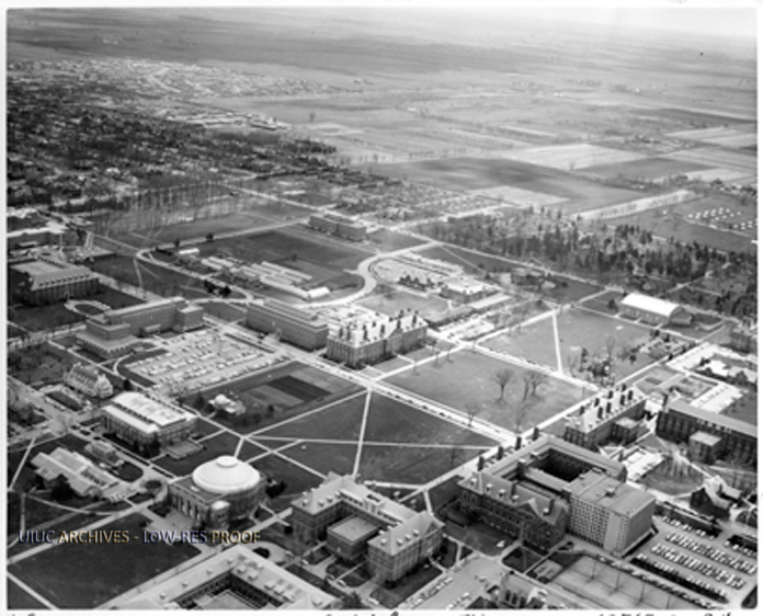 Aerial view of the area just south of the Main Quad at the University of Illinois. Landmarks pictured include Foellinger Auditorium (bottom left), the Observatory (left-center), Gregory Hall (bottom middle), the Library (bottom right), the Morrow Plots (center), and Mumford Hall (center).