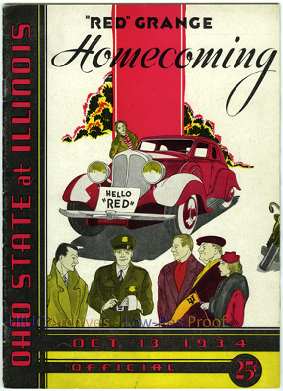 Cover of the program from the "'Red' Grange Homecoming" match-up between the Illini and the Buckeyes at Illinois' Memorial Stadium in 1934. Illinois won 14-13. Cover design by John Van Amerongen.
