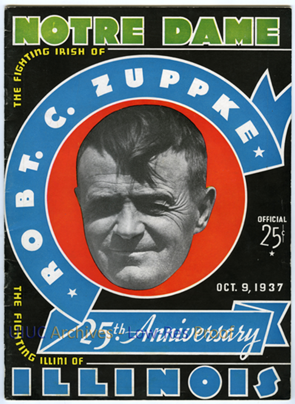 Cover of the program from the match between the Illini and the Irish at Illinois' Memorial Stadium in 1937. The Illini tied the Irish 0-0. This game commemorated Coach Robert Zuppke's 25th season with the Illini.