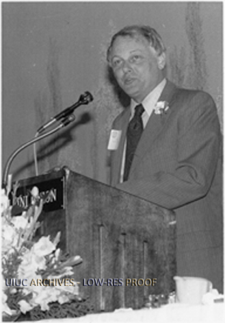 William Gerberding, Chancellor of the University of Illinois at Urbana-Champaign from January, 1978 to June, 1979, speaks from behind a lectern at what appears to be the Illini Union.