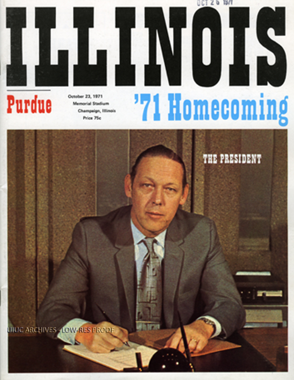 Cover of the program for the Homecoming match between the Illini and the Boilermakers at Memorial Stadium in Champaign. University President John Corbally is featured on the cover. Illinois won 21-7.