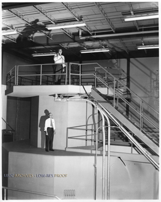 Two men, one on a telephone, stand atop the nuclear reactor at the University of Illinois.