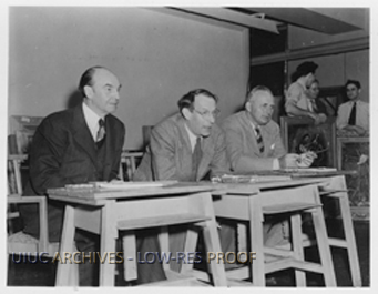 Caption on back reads, "Judging first 'University of Illinois Competitive Exhibition of Contemporary American Painting', left to right: Roland McKinney, director of one of America's largest art shows; Karl Zernbe, and Jerry Farnsworth, nationally known artists."