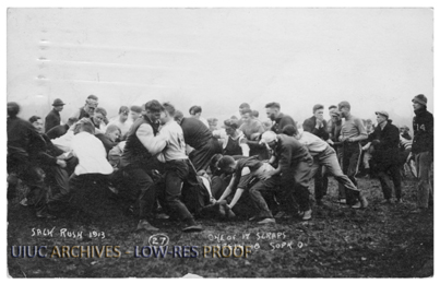 Postcard from University alum, Oscar V. Seed to Mrs. Jennie Wharf (Seed) of Chicago. The image is of "one of 17 scraps" during the Sack Rush of 1913.