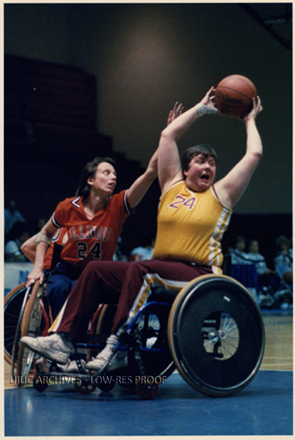A member of the Illinois Women's wheelchair basketball team playing defense.