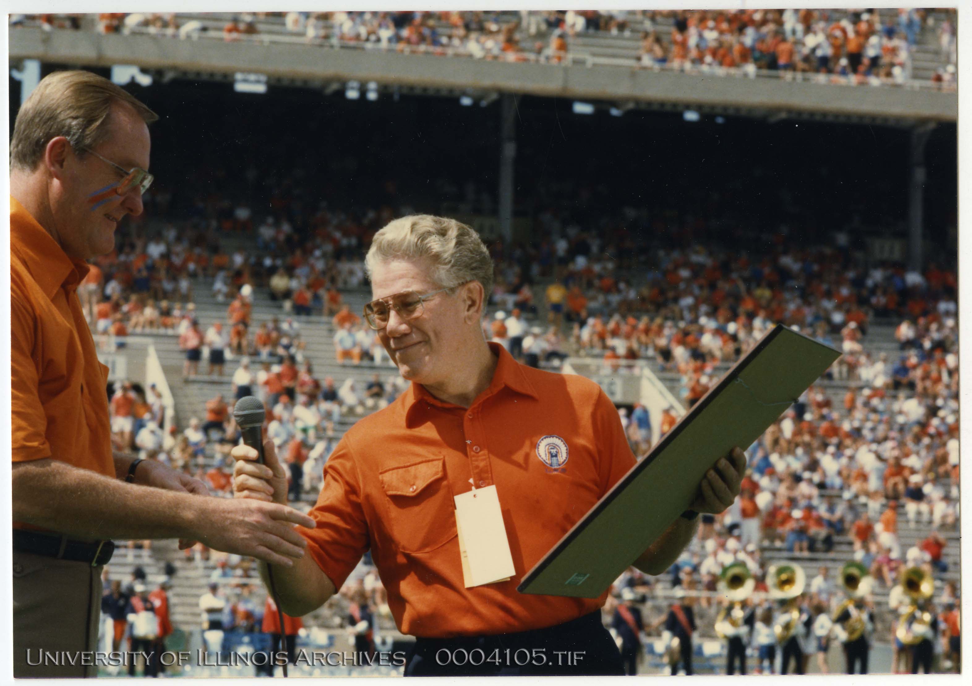 Tim Nugent standing with Illinois Governor Jim Thompson during a public retirement ceremony at an Illinois football game.