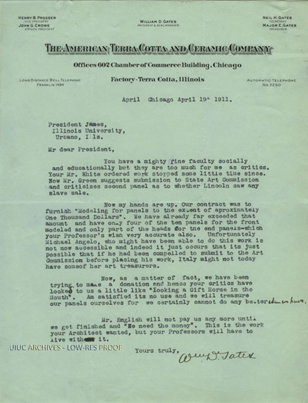 Letter from William D. Gates, head of the American Terra Cotta and Ceramic Company to University President Edmund J. James concerning the terracotta panels on Lincoln Hall and issues Mr. Gates has with completing the project as specified without receiving more funding.