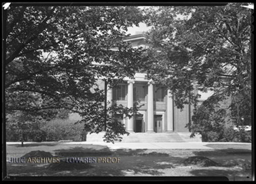 Slightly tree-obstructed view of Smith Music Hall on the campus of the University of Illinois showing the detail of the four columns and three doors that mark the entrance.